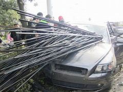 Эти фотографии скорее напоминают съемки какого-то фильма ужасов, чем реальность. Сотни металлических штырей пронзили автомобиль через лобовое стекло. Удивительно, но водителю удалось избежать смерти. Он говорит, что практически ничего не помнит. Последнее, что он видел - это метал, который летел прямо на него.